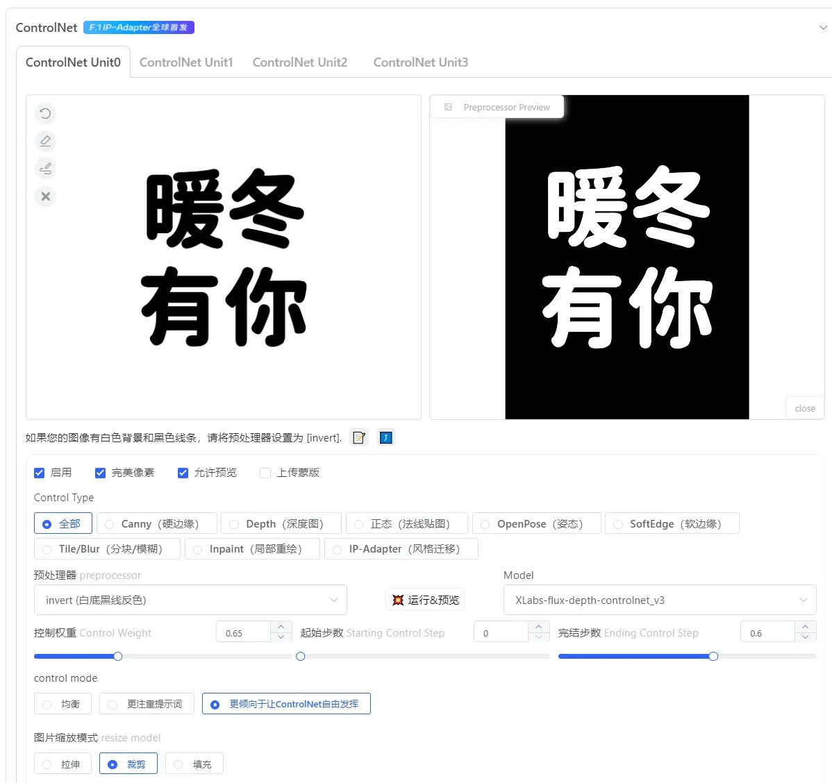 生成中文字需要用CN来控制,推荐控制权重为0.6-0.85左右,字体简单的可以设置成0.6,复杂一些的可以设置成0.8左右,太高出来的效果不好,