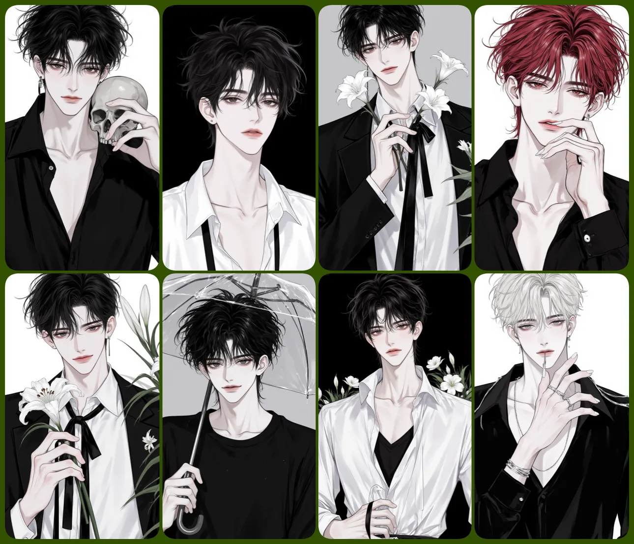 Ethereal Youth v1.0 专注于 冷感唯美的二次元男性人像插画,以 阴郁、优雅、脆弱 的气质塑造角色,常结合百合花、头骨、黑西装与冷色背景。