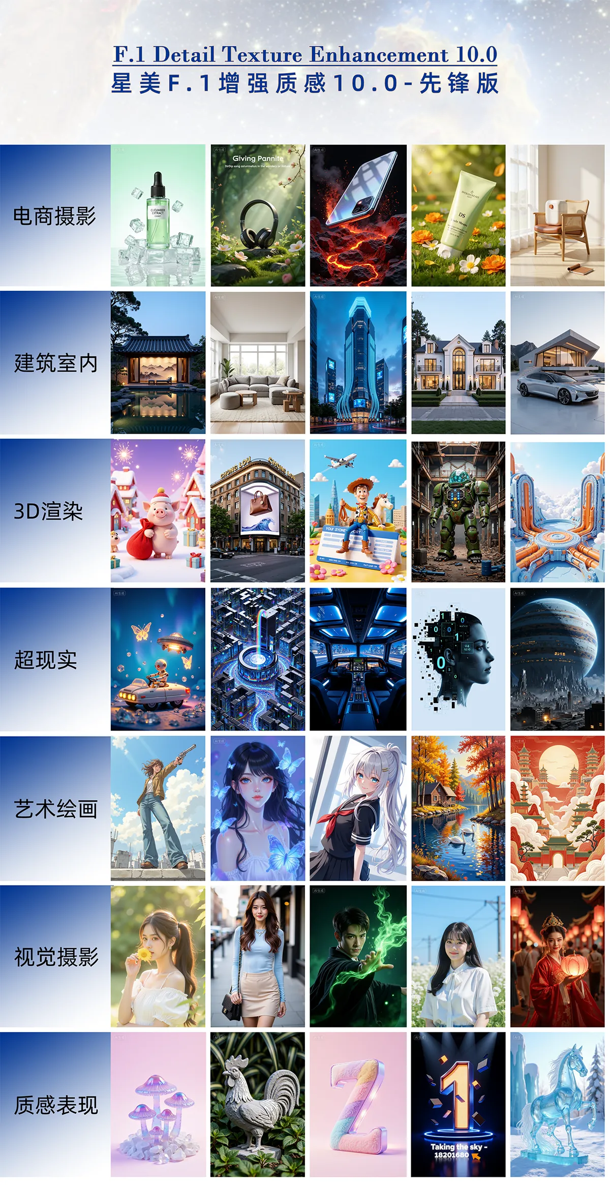 此模型从上线到如今感谢大家一直以来的支持,祝大家新年快乐,这次10.0版本采用单风格=多种类+细节丰富的逻辑叠加模式,对比1.0-9.0版本替换以往的数据集,做了全方位的新增与整合,最佳性能适配多数量风格lora,让lora发挥最广泛的辅助效能, 达到最佳画质,最主要提升真实清晰度和细节,增加画面细节丰富度和适配度, 直接用于Flux生图或图生图也可用于工作流,也可适用于SD1.5 XL,Gpt5,Kontext,krea,flux-high-res,千问,mjdjourney seedream等大模型图片的二次增强细节质感 (图生图)