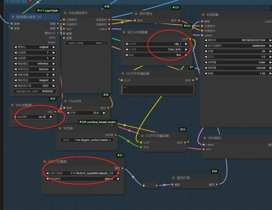 需要选择flux的 clip,vae等,unet加载器的大模型使用fill模型,如下图: