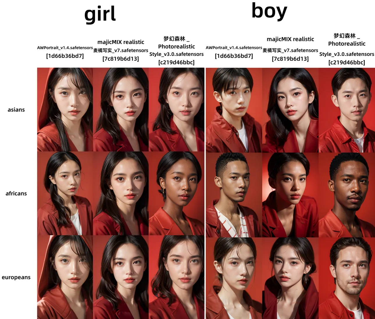 这是一个多元化的写实模型,可以生成不同地域、年龄、性别的写实虚拟摄影,可搭配以下各类摄影主题词: