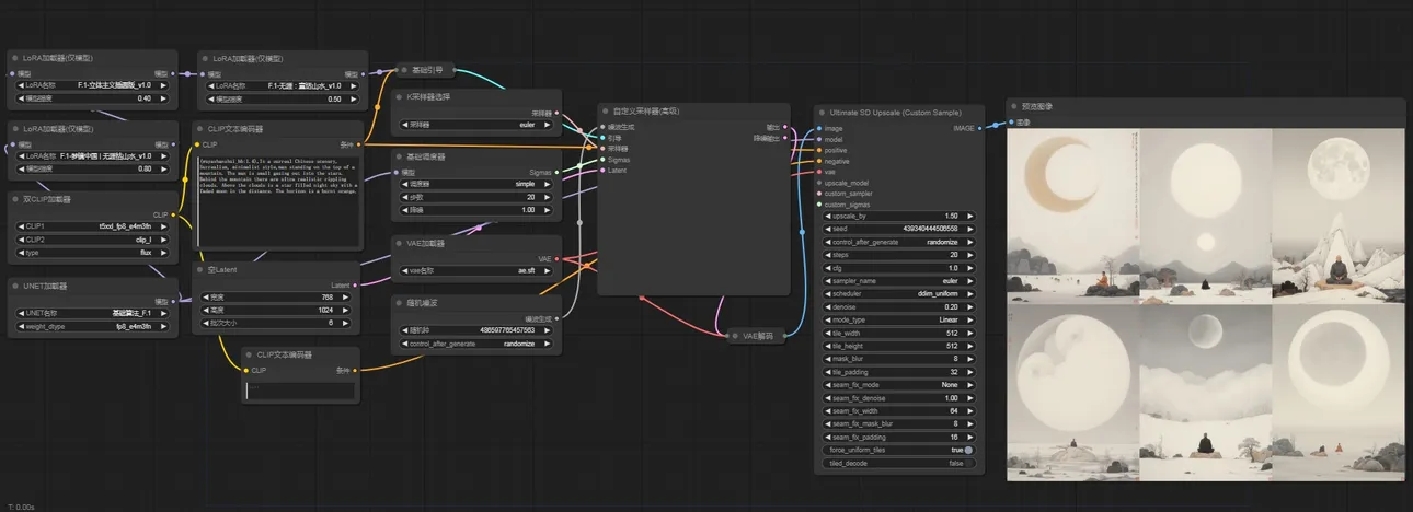 该工作流为Flux国风山水lora多丹混服(几个风格lora混合使用)的在线体验示意,诸位可以在这个思路上自行调整自己想要混服的其他风格lora。
