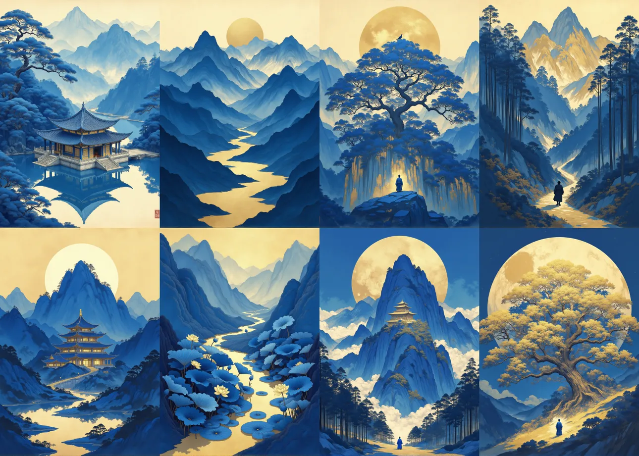 本模型深度融合东方古典美学与现代数字水墨插画技法,构建出一种兼具**“虚静意境”与“设计感美学”的新中式视觉风格。整体风格以青绿晕染、金色点缀、细线勾勒、留白构图、层叠结构**为主要视觉语言,强调东方空间哲学与现代画面张力的融合表达。
