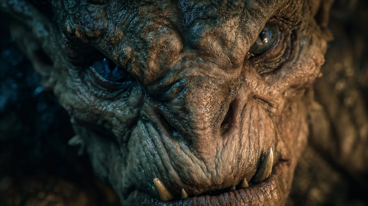 推荐提示词:大特写,怪兽正面面对镜头、粗糙的皮肤、真实的皱纹和纹理、蓝色深邃的眼睛、锋利的牙齿、凶狠的表情、没有配饰、昏暗的背景、低光照、夜间氛围、深棕色和柔和的色调、突出面部纹理的戏剧性侧面照明、光影的高对比度、粗糙和岩石般的皮肤纹理、居中的构图、平视角、专注表现怪物眼睛、电影质感、高度细节、摄影写实