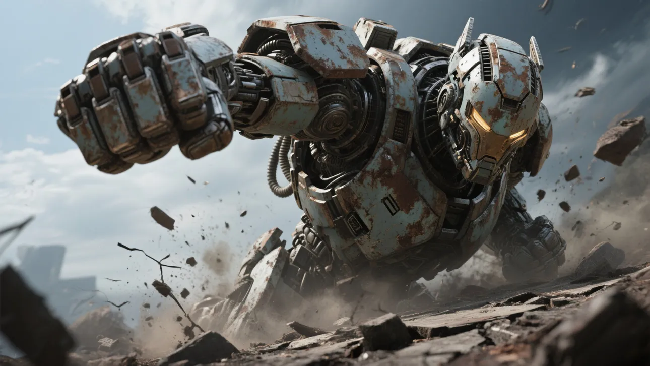 推荐提示词:电影场景,破旧的机甲拳头高高地扬起,然后重重地砸向地面,碎石快速飞溅,镜头快速摇晃