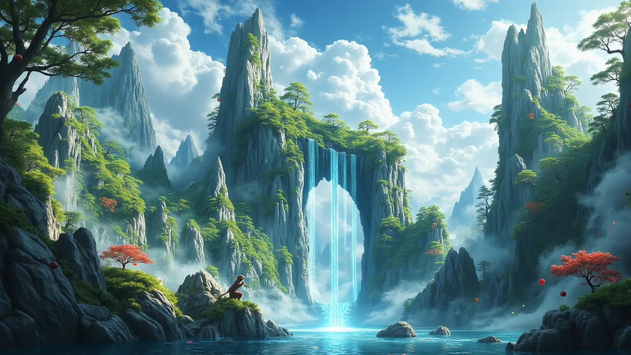 Scene Type: Mythical Fantasy Huaguo Mountain Scene—An idyllic yet mystical realm inspired by Journey to the West.