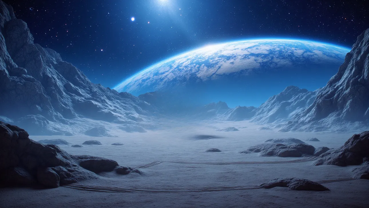 Scene Type: Sci-Fi Interstellar Mountain Scene—A grand scene showing planets and cold mountains in the universe.