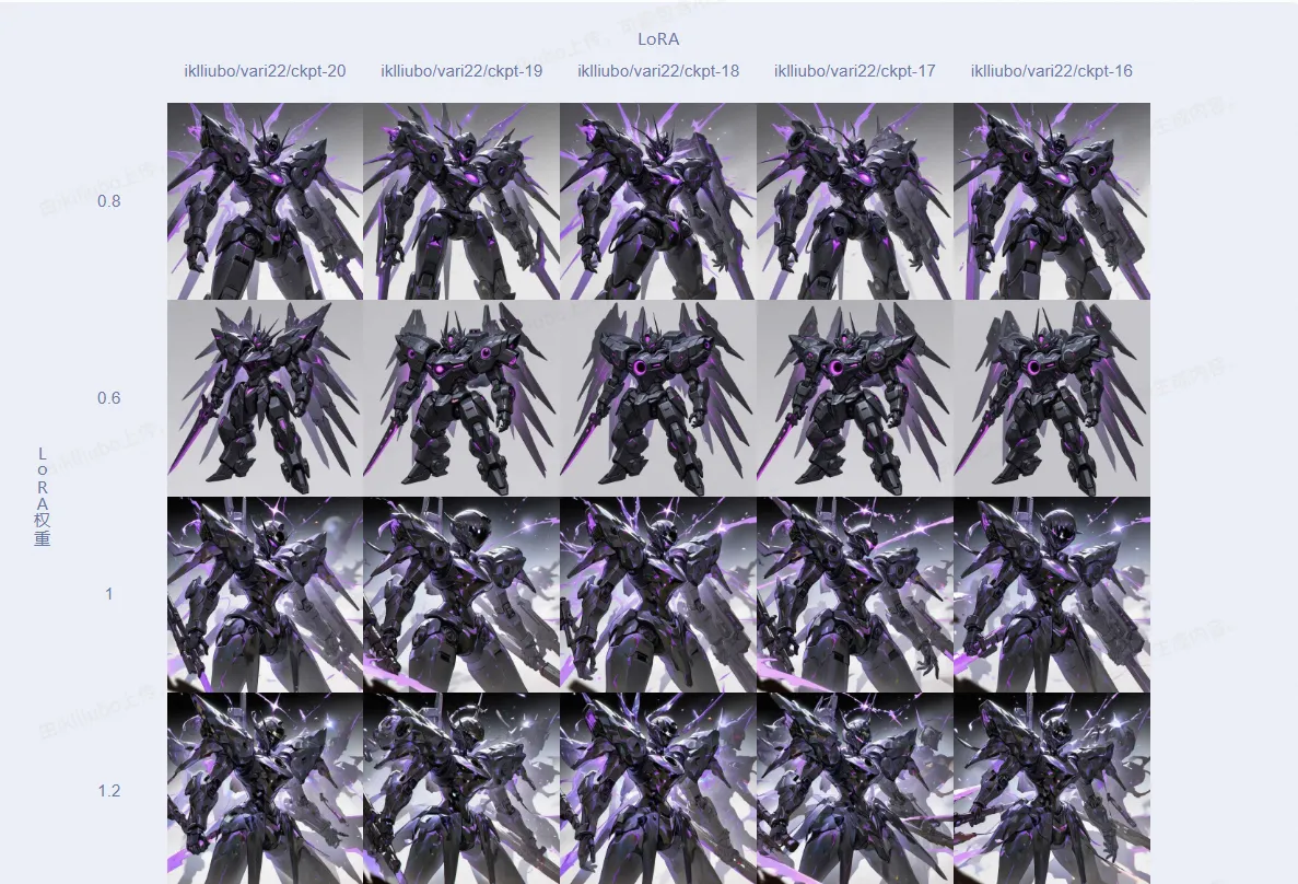 lora权重拉高 可以提升厚涂质感,画面主体呈现 更偏向于插画感 , 权重降低 更偏向于 设计感利好角色设计提示词举例:The mecha is primarily black and dark purple with a surface,texture resembling spatial distortion, and the head has decorations resembling a black hole. Equipped with a void sword that can cut through space, and equipped with a spatial teleporter on the back for short-range spatial jump(机甲主要是黑色和深紫色的,表面有类似空间扭曲的纹理,头部有类似黑洞的装饰。配备可穿越太空的空剑,背部配备空间传送器,可进行短程空间跳跃)