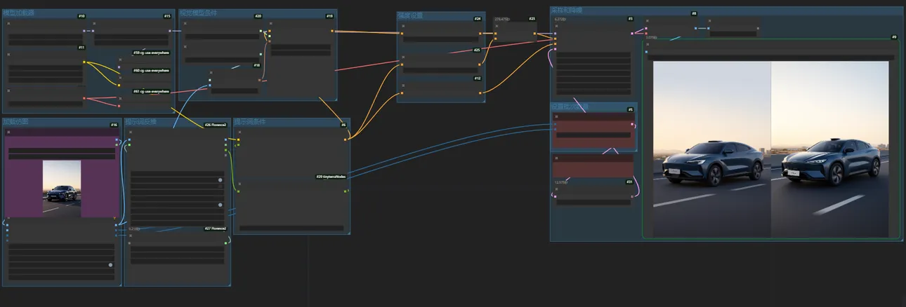 上传一张图像,快速生成多张风格一致的汽车产品图像,工作流自动填写提示词和风格参考,生成图像内容商用范围需您自行判别;