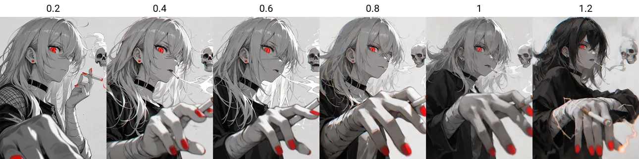 权重建议0.8-1,与其他lora搭配使用时可适当降低权重。