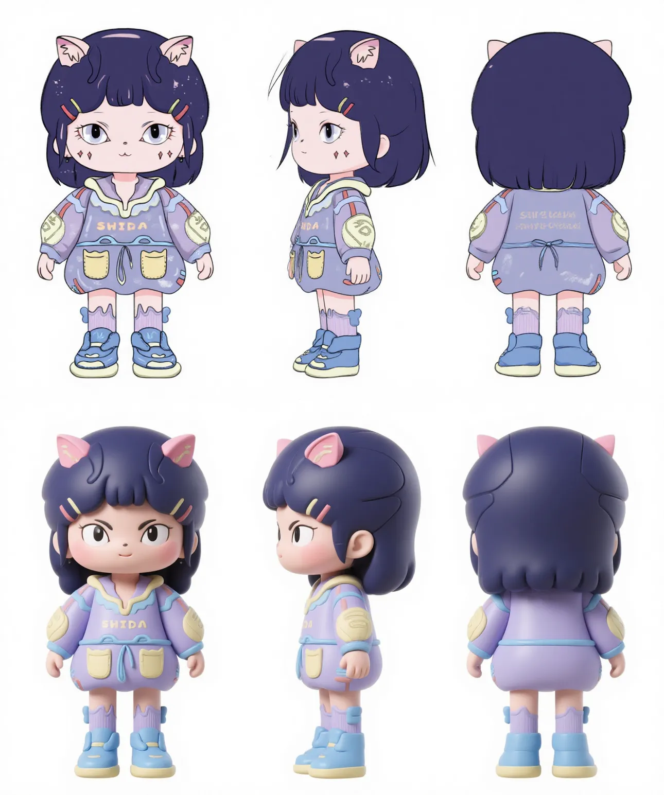 本LORA为高效生成多角度角色设计稿而专门训练的工具, 将二维线稿智能转换为具有准确三维结构的多角度视图(尤其是标准三视图)模型,极大提升从草图到立体化的工作效率。此LoRA特别适用于潮玩设计公司快速输出角色线稿转3D及三视图模板,同时满足: 工业设计师将手绘产品草图转化为带三视图的3D模型;动画/游戏工作室为原画师生成的线稿角色快速建立基础三视图模型;教育中辅助讲解视图投影原理。